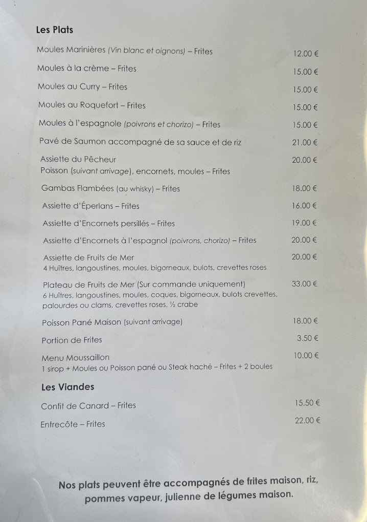 Mais aussi bar, sole, carrelet,… découvrez la carte des poissons selon la pêche du jour. (n’hésitez pas à nous demander lors de votre réservation.)